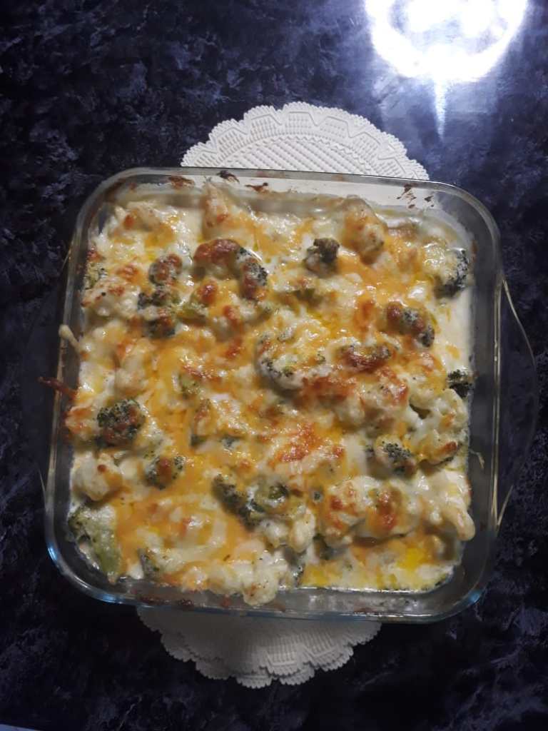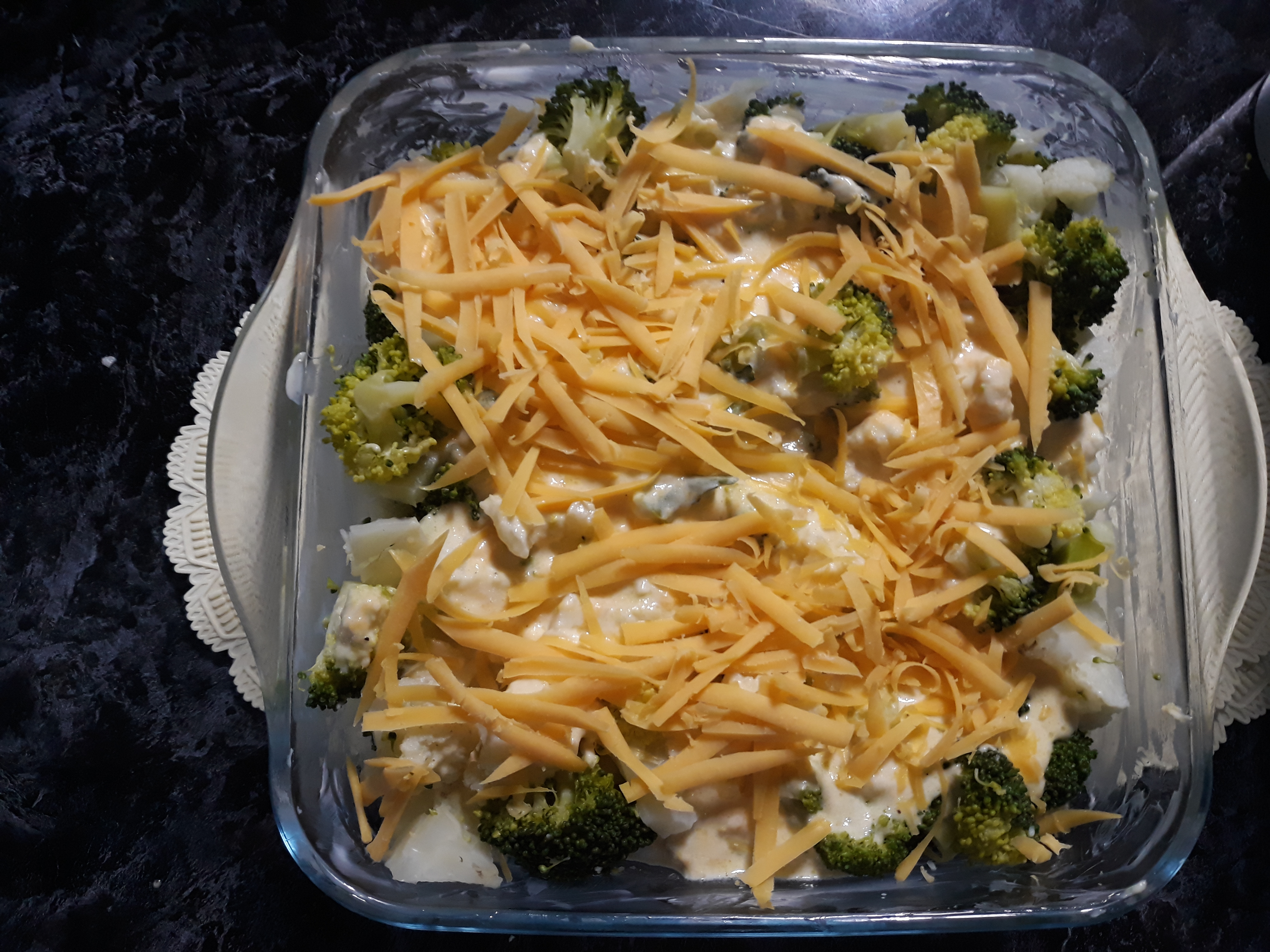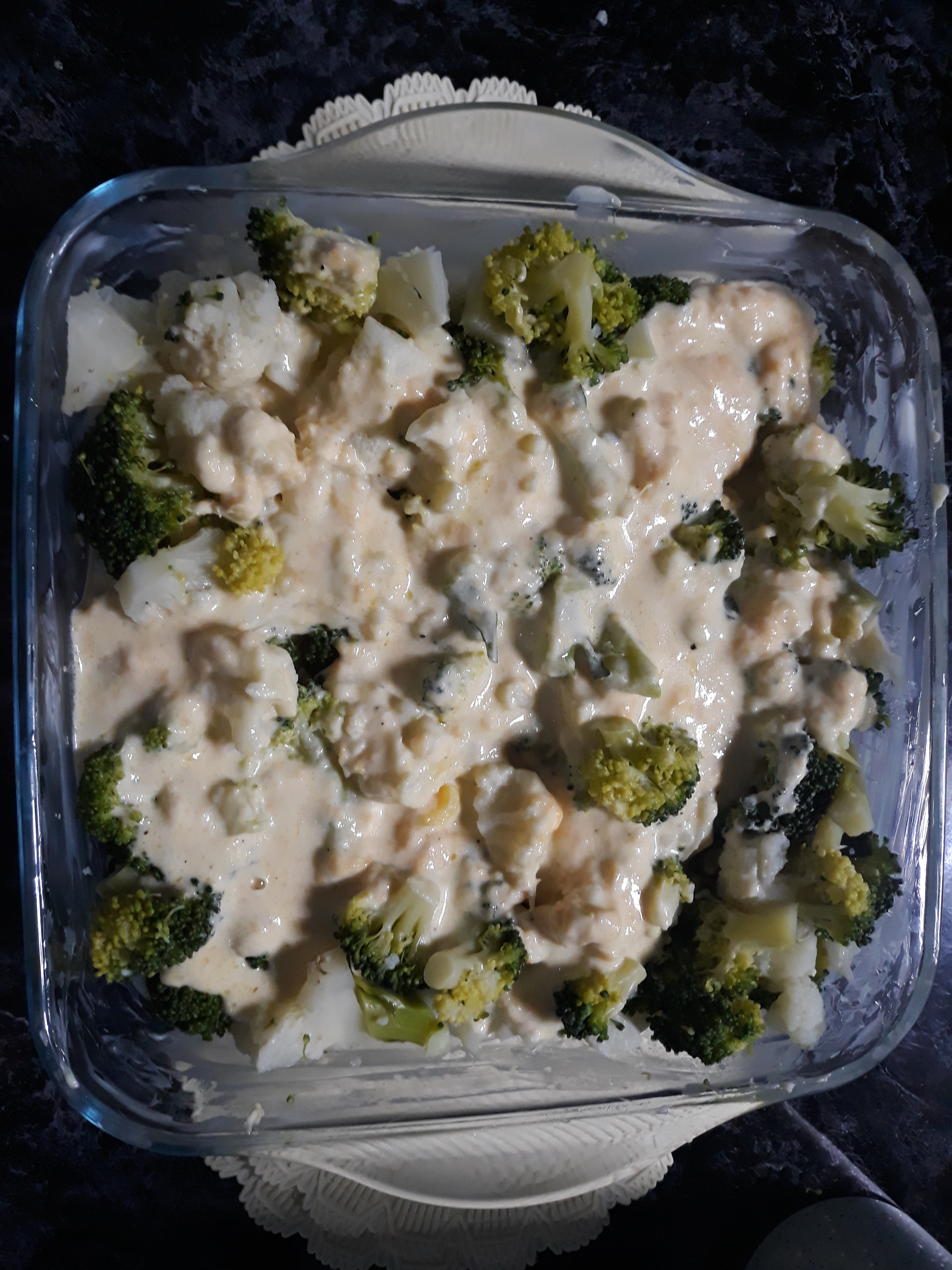 - Gently mix the cauliflower, broccoli, bacon and cheese sauce in a bowl.