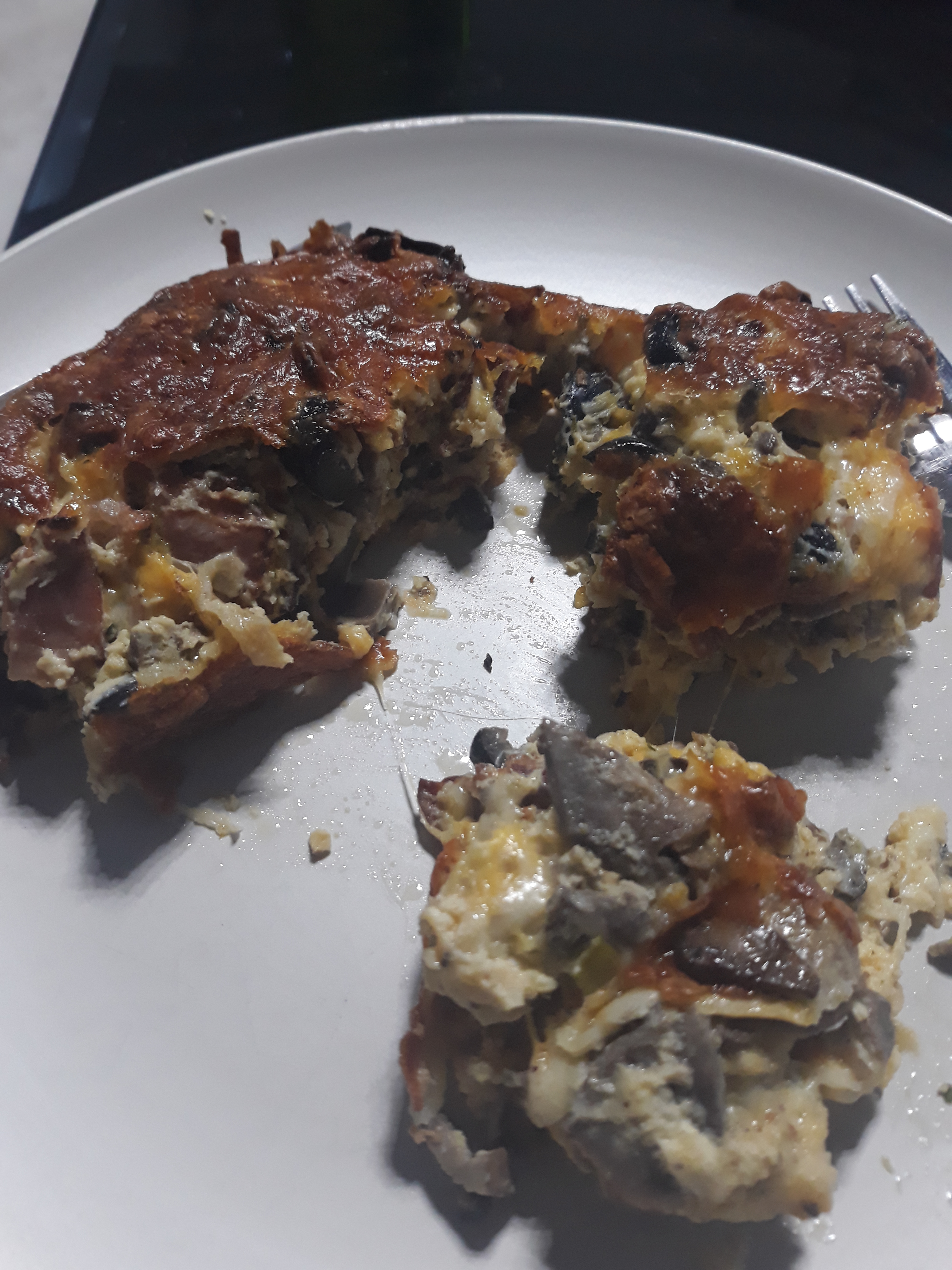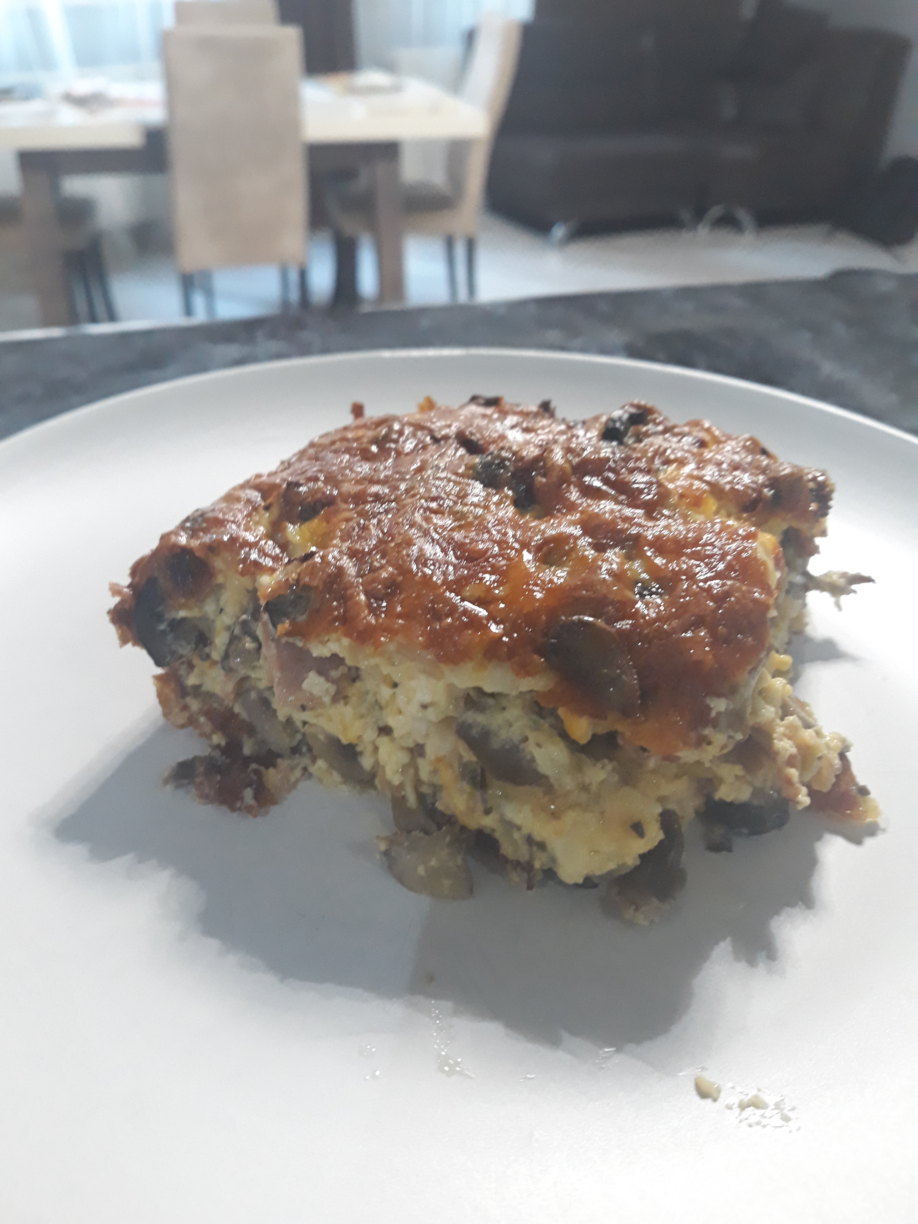 - Add the bacon, mushrooms and onions to the egg mixture.